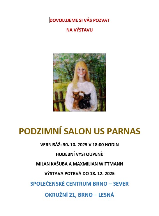 Městská část Brno-sever a Kulturní středisko Omega Vás srdečně zvou na vernisáž výstavy Podzimní salon US Parnas ve Společenském centru Brno-sever.